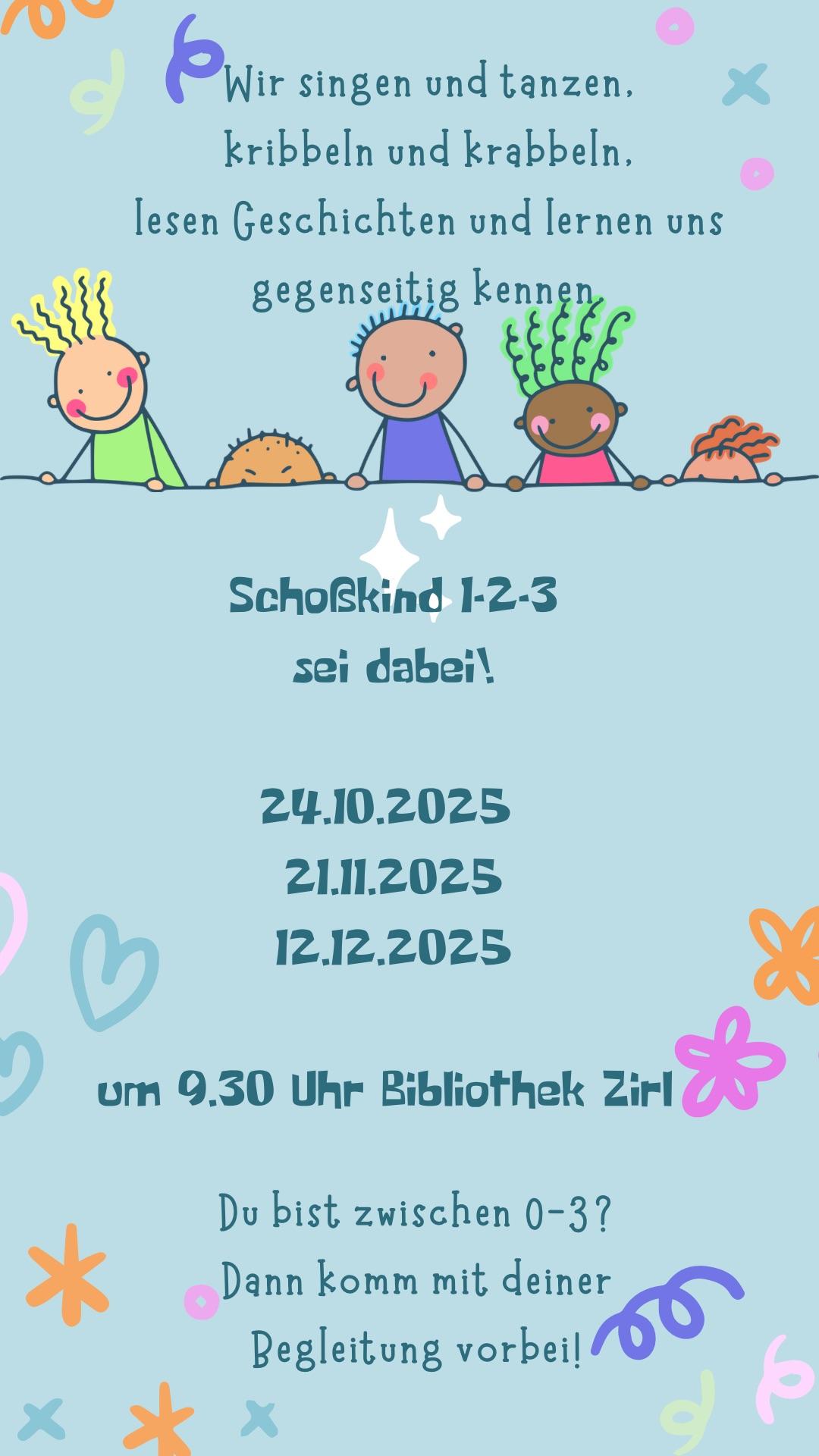 September, 2025 Einladung an Schoßkinder Einladung zum Schoßkindprogramm! Jeweils um 9.30 Uhr in der Bibliothek Zirl, Anmeldung ist nicht nötig!