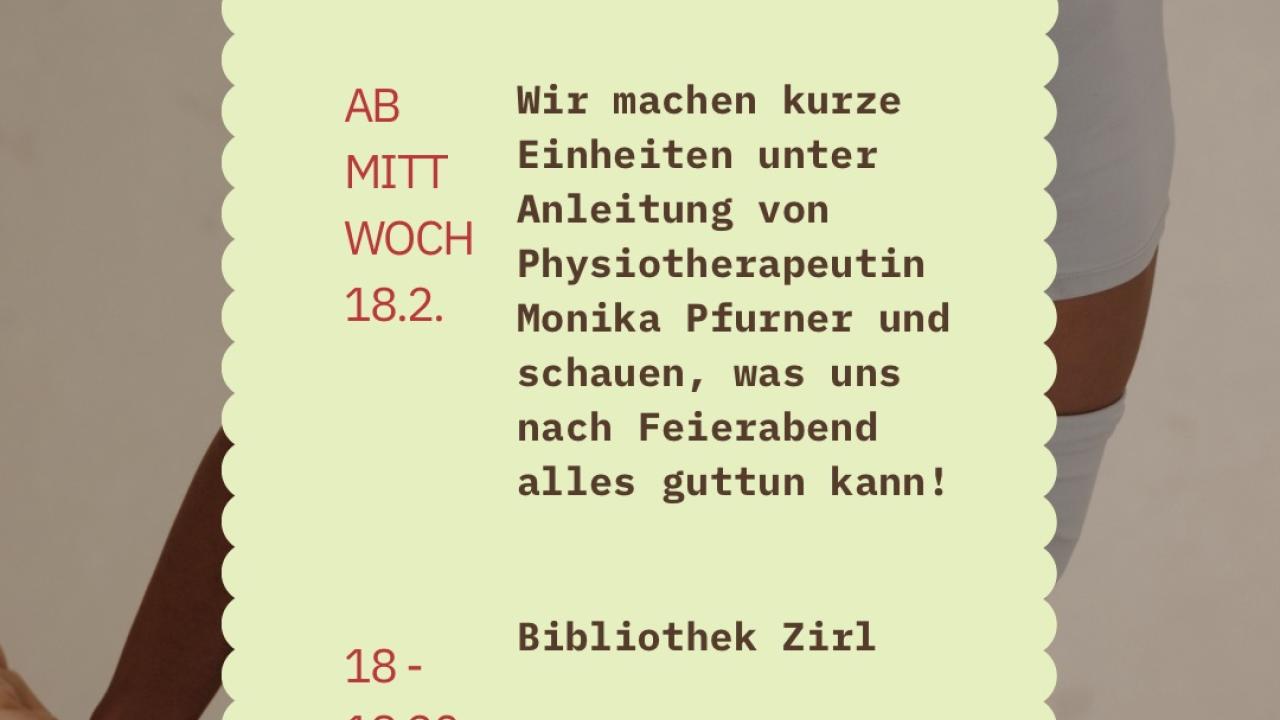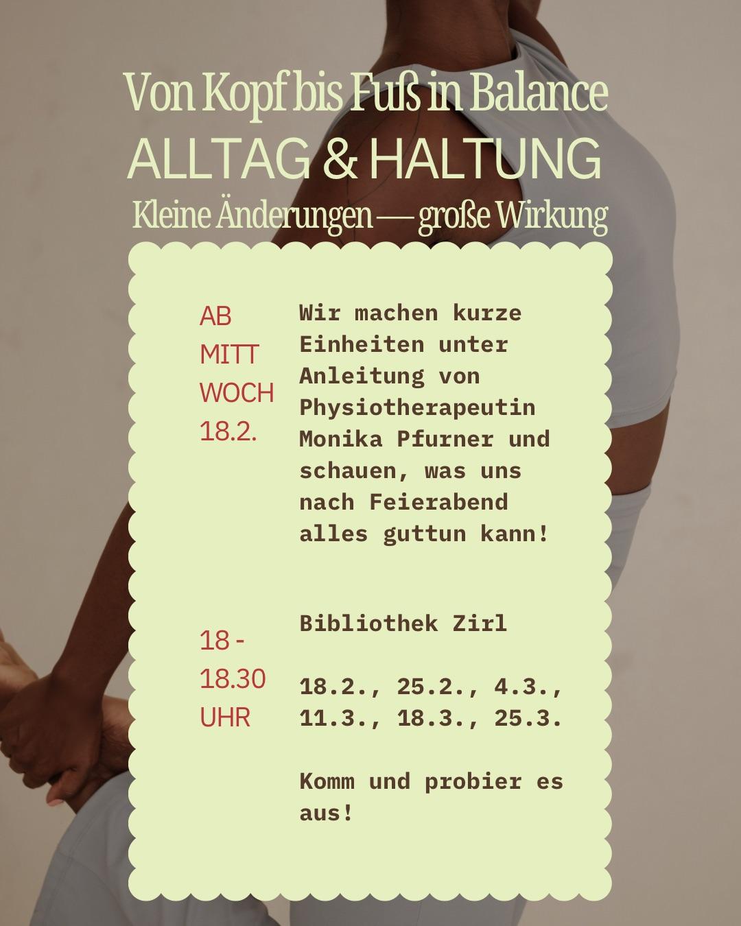 18.03.2026 - 25.03.2026 Von Kopf bis Fuß in Balance Kleine Änderungen - große Wirkung Wir machen kurze Einheiten unter Anleitung von Physiotherapeutin Monika Pfurner und schauen, was uns nach Feierabend alles guttun kann!